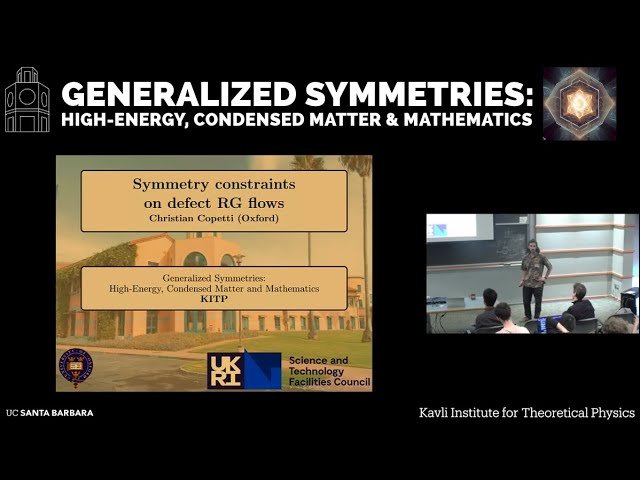This conference talk by Christian Copetti from Oxford explores symmetry constraints on defect renormalization group (RG) flows as part of the "Generalized Symmetries: High-Energy, Condensed Matter and Mathematics" conference held at the Kavli Institute for Theoretical Physics (KITP) at UC Santa Barbara in April 2025. Discover how topological defects can be used to interpret symmetries in quantum field theory, a perspective that has led to significant advances over the past decade. Learn about the generalization of symmetry concepts and their applications across condensed matter, high energy physics, and quantum gravity. The talk contributes to a broader conference bringing together experts to discuss recent advances and open problems in the field, coordinated by Maissam Barkeshli, Michele Del Zotto, Sakura Schafer-Nameki, and Shu-Heng Shao.