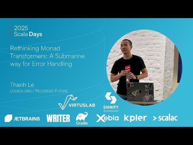 Explore an innovative "submarine" approach to error handling in Scala that seamlessly integrates arbitrary error types into the main Throwable channel within effect contexts. Learn how this technique provides functionality similar to try/catch blocks while maintaining the flexibility to handle custom error types within monadic contexts, offering a robust alternative to traditional monad transformers. Discover how implicit capabilities enable introduction and elimination of errors, creating a balance between code ergonomics, performance, and precise error control. Examine the underlying problems with current error handling approaches and understand how Scala 3's advanced features, including context functions and inline mechanisms, enable this sophisticated solution. Gain insights into practical implementation techniques that leverage static type checking while maintaining simplicity and precision in error management, particularly valuable for developers working with complex functional programming patterns in Scala applications.