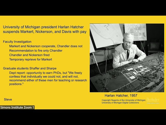 Explore the challenges faced by mathematician Steve Smale and faculty member Chandler Davis at the University of Michigan during the McCarthy era in this 25-minute conference talk. Examine how both individuals, who were Communist Party members, navigated institutional hostility where the administration and many faculty actively worked to sabotage the careers of anyone associated with the far left. Learn about the specific ways the university enabled McCarthyism and the obstacles these academics had to overcome during this politically charged period in American history. Discover the historical context of academic freedom and political persecution through the lens of these two mathematicians' experiences at a major American university during the 1950s.
