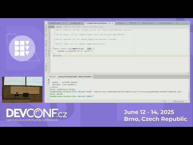 Explore the latest innovations in Java development through this 34-minute conference talk that showcases the rapid evolution of the Java platform. Discover recently added language features including multi-line string literals, simple data carriers, and pattern matching capabilities. Learn about significant library and JVM enhancements such as virtual threads and improved Java-native code interconnection. Get insights into upcoming features in the development pipeline, including value classes for the Java Virtual Machine and enhanced pattern matching improvements. Understand how Java's new six-month release schedule enables faster delivery of platform features, with major updates arriving twice yearly. Watch live demonstrations of both recently implemented and newly developed Java platform features and improvements, presented by Jan Lahoda at DevConf.CZ 2025.