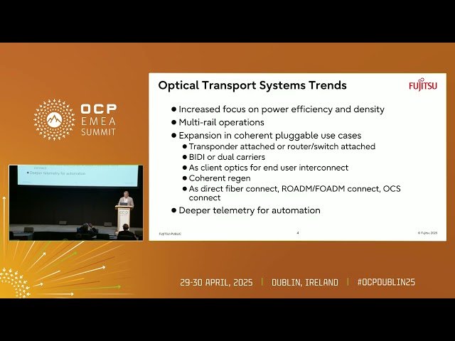 This conference talk from the Open Compute Project features Muhammad Sarwar from Fujitsu's Global Planning and Strategy team discussing advancements in data center interconnects (DCI) with a focus on energy efficiency and high-speed solutions. Explore key technologies and innovations in optical line systems, coherent transceivers, and network automation designed to enhance network performance while reducing environmental impact. The 35-minute presentation, titled "The Green Terabits," provides valuable insights into creating more sustainable high-speed data center connectivity solutions.