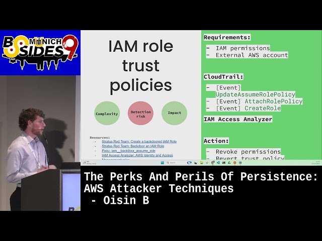 Learn advanced AWS attacker techniques focused on establishing and maintaining persistence within cloud environments through this 28-minute conference talk from BSidesMunich. Explore the dual nature of persistence mechanisms in AWS infrastructure, examining both the advantages they provide to legitimate operations and the significant security risks they pose when exploited by malicious actors. Discover specific attack vectors that threat actors use to maintain long-term access to AWS accounts and resources, including techniques for evading detection and surviving common security remediation efforts. Gain insights into the methods attackers employ to establish backdoors, create shadow administrative access, and leverage AWS services for persistent access that can survive credential rotations and security audits. Understand the defensive implications of these techniques and develop strategies to identify, prevent, and remediate persistence-based attacks in your AWS environment.