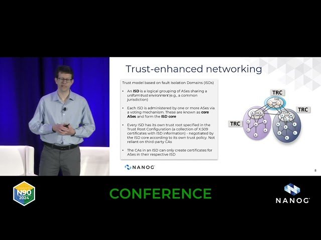 Learn about the next-generation SCION network architecture in this 42-minute conference talk from NANOG, where Professor Adrian Perrig from ETH Zürich explores how this innovative system provides enhanced security and scalability for critical infrastructure communication. Discover the technical implementation details of SCION's resilient control-plane operation and inter-domain routing capabilities that operate independently from traditional BGP infrastructure. Explore real-world use cases since its 2017 production deployment, including security features like geo-fencing and path validation, while understanding how SCION enables new business opportunities for Internet Service Providers. Gain insights into SCION's interoperability with existing infrastructure, deployment strategies, and the crucial roles of open source communities, Internet Exchange Points (IXPs), and the SCION Association in advancing this secure communication technology.