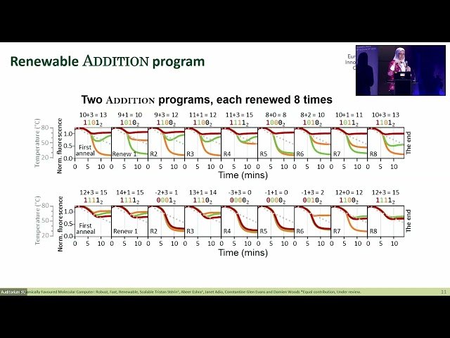 Learn about a revolutionary approach to DNA computing that overcomes the single-use limitation of traditional molecular computing systems through this 25-minute conference presentation. Discover how the Scaffolded DNA Computer (SDC) leverages thermodynamic principles to execute computations using simple thermal annealing, naturally reaching correct outputs by moving to equilibrium without requiring explicit error correction mechanisms. Explore the system's demonstrated capabilities in performing arithmetic and cellular automata computations on 12-bit and 24-bit memory in under a minute, and scaling up to 75 bits over several hours. Understand the breakthrough concept of renewable DNA computing, where the same molecular mix can be reset and reused multiple times using just two DNA strands - one for program reset and another for new input introduction. Examine how these thermodynamically favoured principles extend to DNA storage platforms, enabling computable, scalable, rewritable, and sustainable alternatives to destructive sequencing methods. Gain insights into how this approach reduces material waste, minimizes energy consumption, and creates pathways for long-term, low-energy computing and storage technologies that could transform molecular computation from disposable to renewable systems.
