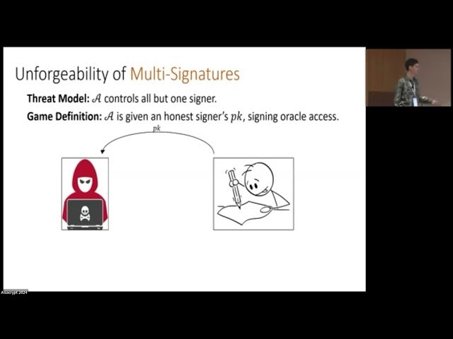 Join a specialized session from Asiacrypt 2024, chaired by Anshu Yadav, exploring the intricacies and applications of threshold signatures in cryptography. Delve into cutting-edge research and developments in distributed signature schemes during this 73-minute academic presentation, which forms part of the International Association for Cryptologic Research (IACR) conference series. Access supplementary materials, including research papers and presentation slides, to enhance understanding of this advanced cryptographic concept.