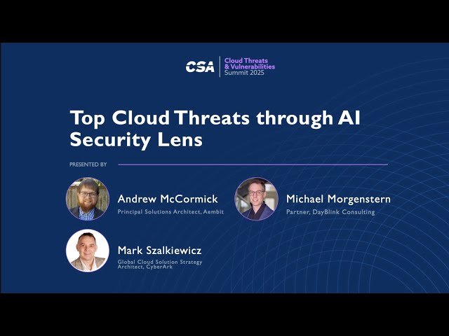 This 25-minute conference talk from the Threats & Vulnerabilities Summit 2025 examines the Top Threats to Cloud Computing 2024 through an AI security perspective. Explore how cloud adoption's acceleration creates sophisticated threat landscapes where artificial intelligence acts as both amplifier and mitigator. Discover how attackers leverage AI for automated vulnerability discovery and social engineering while learning about AI-driven defense strategies including real-time anomaly detection, automated configuration analysis, and predictive threat hunting. Featuring insights from Mark Szalkiewicz (CyberArk), Michael Morgenstern (DayBlink Consulting), and Andrew McCormick (Aembit), gain practical strategies for applying AI to cloud security, best practices for safeguarding cloud environments, and key findings from the Cloud Security Alliance's latest threat report. The session provides essential knowledge for security professionals looking to understand both offensive and defensive applications of AI in modern cloud security.