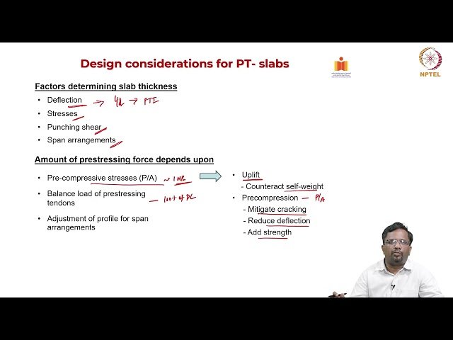Learn the design principles and analysis methods for two-way post-tensioned (PT) slabs in this 23-minute lecture from NPTEL-NOC IITM. Explore the structural behavior, load distribution patterns, and design considerations specific to two-way PT slab systems. Understand how post-tensioning forces are applied in both directions to create efficient structural elements capable of spanning large areas with reduced thickness. Examine the differences between one-way and two-way slab behavior, including moment distribution, deflection characteristics, and reinforcement requirements. Discover the advantages of two-way PT slabs in terms of structural efficiency, reduced dead loads, and architectural flexibility. Master the analytical approaches used to determine bending moments, shear forces, and deflections in two-way PT slab systems, including the application of relevant design codes and standards.