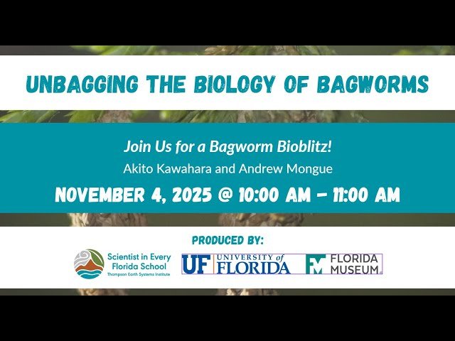 Join this 55-minute webinar exploring the fascinating world of bagworms through a collaborative bioblitz event featuring scientists from the Florida Museum's McGuire Center for Lepidoptera and Biodiversity and UF/IFAS Entomology and Nematology Department. Discover the unique biology, diversity, and remarkable adaptations of these unusual organisms while learning about scientific research methods and related career opportunities in entomology. Engage with expert researchers through interactive Q&A sessions designed to accommodate learners of all levels, from curious beginners to advanced students interested in lepidoptera and biodiversity studies. Gain insights into how scientists conduct field research and contribute to our understanding of these ecologically important insects that construct protective cases from environmental materials.