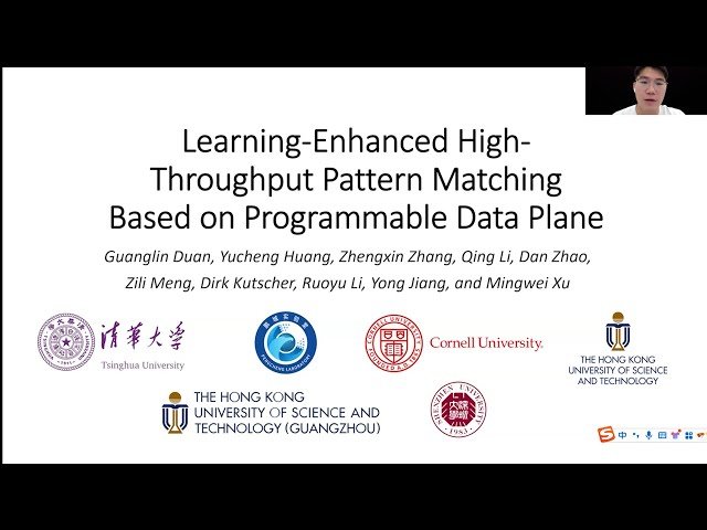 Explore a conference presentation introducing Trochilus, a novel framework that combines machine learning with programmable data plane processing to achieve high-throughput pattern matching for network security applications. Learn how this innovative approach addresses the challenges of maintaining performance and cost-effectiveness while handling growing network traffic and increasingly complex patterns in modern large-scale network systems. Discover the technical implementation that leverages a byte-level recurrent neural network (BRNN) to model complex patterns while preserving expert knowledge and enabling automated updates for sustained accuracy. Understand the semi-supervised knowledge distillation (SSKD) mechanism that converts the BRNN into a lightweight, data-plane-friendly soft multi-view forest (SMF) deployable as match-action tables. Examine the novel entry cluster algorithm that minimizes expensive TCAM requirements, making the solution scalable to large network environments. Review evaluation results demonstrating multi-Tbps throughput capabilities, support for various pattern sets, and high accuracy maintenance through automatic updates, presented by researchers from Peng Cheng Laboratory, Tsinghua Shenzhen International Graduate School, Cornell University, Hong Kong University of Science and Technology, and other leading institutions at USENIX ATC '25.