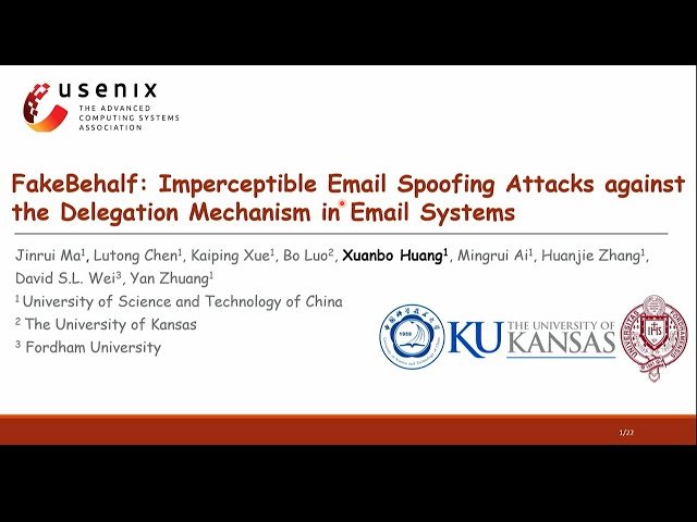 Explore a 12-minute conference presentation from USENIX Security '24 that reveals critical vulnerabilities in email systems' delegation mechanisms. Learn how researchers from the University of Science and Technology of China, University of Kansas, and Fordham University uncovered security flaws allowing attackers to bypass DKIM and DMARC protections through spoofed Sender fields. Discover findings from their 50-participant study showing that half of users are vulnerable to deceptive delegate information, and examine the impact of novel email spoofing attacks tested across 16 service providers and 20 email clients. Understand their proposed validation scheme and security enhancement recommendations for protecting against delegation mechanism exploitation in email systems.