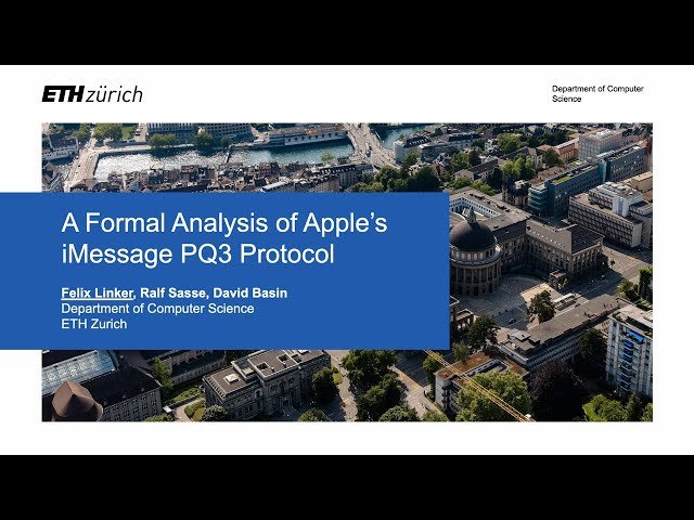 Explore a comprehensive formal verification analysis of Apple's iMessage PQ3 protocol in this 16-minute conference presentation from USENIX Security '25. Discover how researchers from ETH Zurich conducted machine-checked security proofs using the TAMARIN prover to verify this post-quantum secure messaging protocol that provides strong security guarantees against quantum computing threats. Learn about PQ3's architecture, which combines Apple's identity services with a custom post-quantum secure initialization phase and employs an extended double ratchet construction similar to Signal's approach. Examine the detailed formal model presented by the researchers, including precise specifications of fine-grained security properties and the novel integration of post-quantum secure key encapsulation into relevant protocol phases. Understand how the analysis covers both key ratchets with unbounded loops, demonstrating capabilities previously thought to be beyond the scope of symbolic provers like TAMARIN, and gain insights into the protocol's post-quantum, post-compromise security features that ensure device-to-device messaging remains secure in a quantum computing era.
