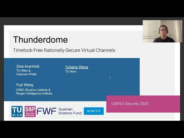 Explore a groundbreaking conference presentation introducing Thunderdome, the first timelock-free payment channel network (PCN) designed to address critical vulnerabilities in blockchain transaction systems. Learn how this innovative solution eliminates the need for timelocks while maintaining security through a novel committee-based approach using non-trusted watchtowers called "wardens." Discover the technical architecture that enables multi-hop transactions between parties without shared channels, leveraging virtual channel design principles to extend timelock-free payment primitives. Examine the tailored incentive mechanisms that ensure protocol compliance and understand the formal game-theoretic analysis demonstrating security when all participants act rationally. Review the practical implementation on Ethereum, including cost analysis showing deployment costs of approximately $15 and worst-case channel closure costs of about $7, validating the feasibility of this approach to solving timelock and censoring attacks in payment channel networks.