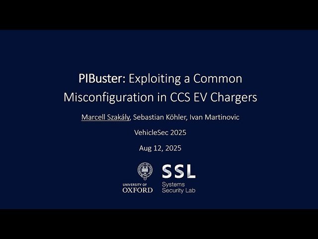 Explore a critical security vulnerability in electric vehicle charging infrastructure through this 10-minute conference presentation from VehicleSec '25. Learn about PIBuster, a newly discovered attack vector that targets Qualcomm HomePlug GreenPHY modems commonly used in Combined Charging System (CCS) chargers and vehicles. Discover how researchers from the University of Oxford identified a widespread misconfiguration in the Parameter Information Block (PIB) that enables attackers to overwrite critical modem configurations. Examine the methodology used to create a safe laboratory testbed for evaluating PIB security and understand the specific conditions that make this attack possible. Review findings from a comprehensive analysis of 69 real-world EV charging stations, revealing that 41 exhibited the vulnerable configuration. Understand the implications of this high-impact attack that can cause persistent denial of service requiring hardware replacement to resolve, highlighting significant security concerns in the rapidly expanding EV charging infrastructure.