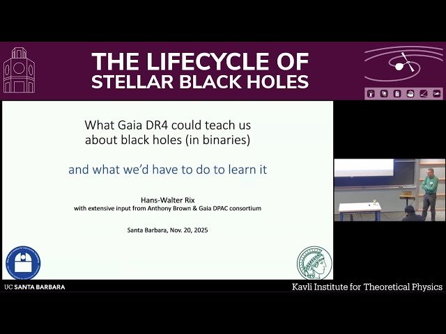 Explore how the upcoming Gaia Data Release 4 will revolutionize our understanding of black holes in binary systems in this 45-minute conference talk by Hans-Walter Rix from the Max Planck Institute for Astronomy. Learn about the convergence of multiple astronomical detection methods that are unveiling new populations of stellar mass black holes, including gravitational wave detections, Gaia's discovery of dormant black holes in detached binaries, microlensing observations of isolated black holes, and time domain surveys capturing transient events. Discover how these complementary observational approaches are revealing black hole populations that extend far beyond the traditionally known accreting systems identified through X-ray and radio surveys. Examine the complete lifecycle of stellar black holes, from their origins as massive star progenitors through core collapse and associated transients, to their existence as dormant or accreting objects, and potentially their final fate as gravitational wave sources during mergers. Gain insights into how the astronomical community is developing new observational and theoretical strategies to address fundamental questions about stellar black hole evolution, presented as part of the Kavli Institute for Theoretical Physics conference on the lifecycle of stellar black holes.