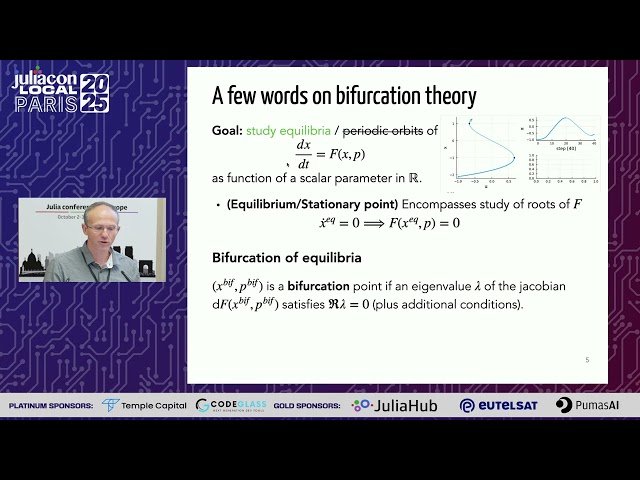 Explore the latest developments in BifurcationKit.jl through this 31-minute conference talk from JuliaCon Local Paris 2025. Learn about the powerful and flexible Julia package designed for numerical study of bifurcations in nonlinear systems. Discover practical applications for analyzing dynamical systems, including techniques for studying fixed points, creating bifurcation diagrams, continuing solutions, and examining codimension-1 bifurcations. Follow along with interactive coding examples that demonstrate how to apply the package to both low- and high-dimensional systems. Gain insights into the computational tools that power continuation and stability analysis in modern dynamical systems research. Master the implementation of BifurcationKit.jl for your own research and development projects in nonlinear dynamics and bifurcation theory.