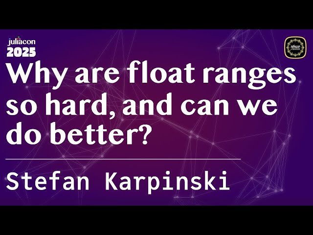 Explore the complex mathematical challenges behind floating-point ranges in Julia programming through this 26-minute conference talk from JuliaCon Global 2025. Delve into why interpreting float ranges like 0.1:0.2:0.7 presents unexpected computational difficulties, particularly when determining whether 0.1 was intended to represent the fraction 1/10. Learn about Julia's current approach of computing the simplest fraction for each float value and checking validity, and discover why this method can fail, leading to ranges that are too short or contain incorrect interior points. Understand how some valid range interpretations require considering start, step, and stop values together rather than independently rationalizing individual float values. Examine the formal definition of what constitutes a valid interpretation of a floating-point range as a triple of rationals, and explore the challenge of selecting the optimal interpretation from infinite possibilities. Discover how this seemingly simple problem connects to advanced mathematical concepts including integer linear programming, numerical semigroup theory, and the Stern-Brocot tree of fractions, while maintaining the computational efficiency required for range object construction.