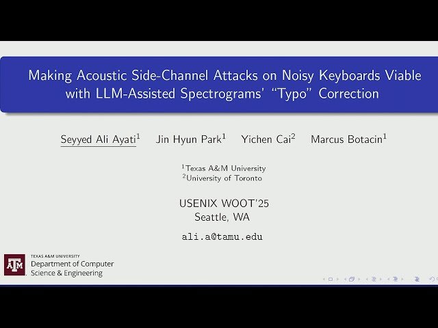 Explore a groundbreaking conference presentation that demonstrates how to enhance acoustic side-channel attacks on keyboards using advanced machine learning techniques. Learn about the integration of Visual Transformers and Large Language Models to overcome the limitations of current state-of-the-art models in noisy, real-world conditions. Discover how researchers from Texas A&M University and University of Toronto developed the first approach combining Visual Transformers for capturing long-term contextual information with LLMs for correcting keystroke prediction errors or "typos." Understand the methodology behind using transformer architectures to analyze audio signals from keyboard typing captured through device microphones, and examine how this dual-strategy approach addresses the challenge of inferring sensitive information from keystroke sounds in realistic noisy environments. Gain insights into the evaluation results showing that Visual Transformers achieve superior performance compared to previous CNN benchmarks, while LLMs like GPT-4o significantly boost error-correction capabilities, with comparable results achievable using lightweight, fine-tuned smaller models that are 67 times smaller than GPT-4o through Low-Rank Adaptation techniques.