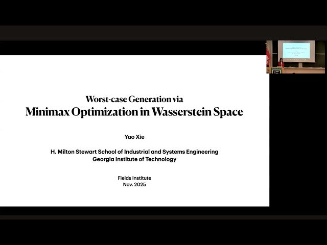 Learn about worst-case generation through minimax optimization techniques applied in Wasserstein space in this 33-minute conference talk. Explore advanced mathematical concepts at the intersection of optimal transport theory and optimization, examining how minimax approaches can be utilized within the geometric framework of Wasserstein spaces. Discover the theoretical foundations and practical applications of these methods as presented by a researcher from Georgia Institute of Technology. Gain insights into cutting-edge developments in stochastic optimal transport, projections, and their diverse applications across various fields of mathematics and machine learning.