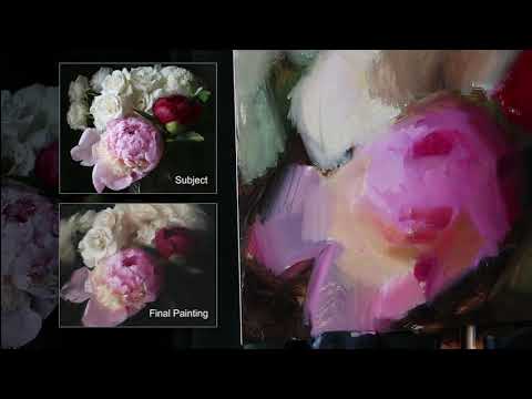 Starting with a colored under painting wash, Sadie shares every step for how she creates a one-day painting of a beautiful arrangement of pink peonies and white roses.