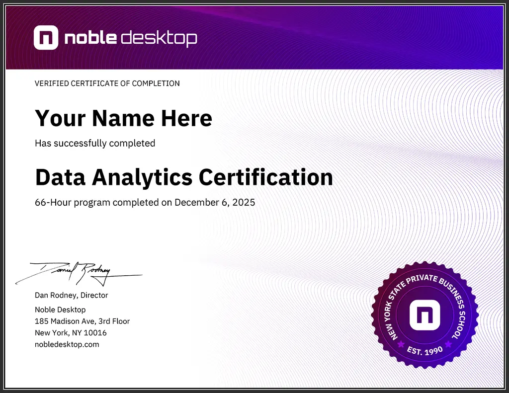 Transform raw data into actionable insights using Excel, SQL, Tableau, and Python for business decision-making. Build job-ready skills through hands-on bootcamps and certificates on Noble Desktop, edX, and LinkedIn Learning, covering visualization, business intelligence, and AI-powered analytics.